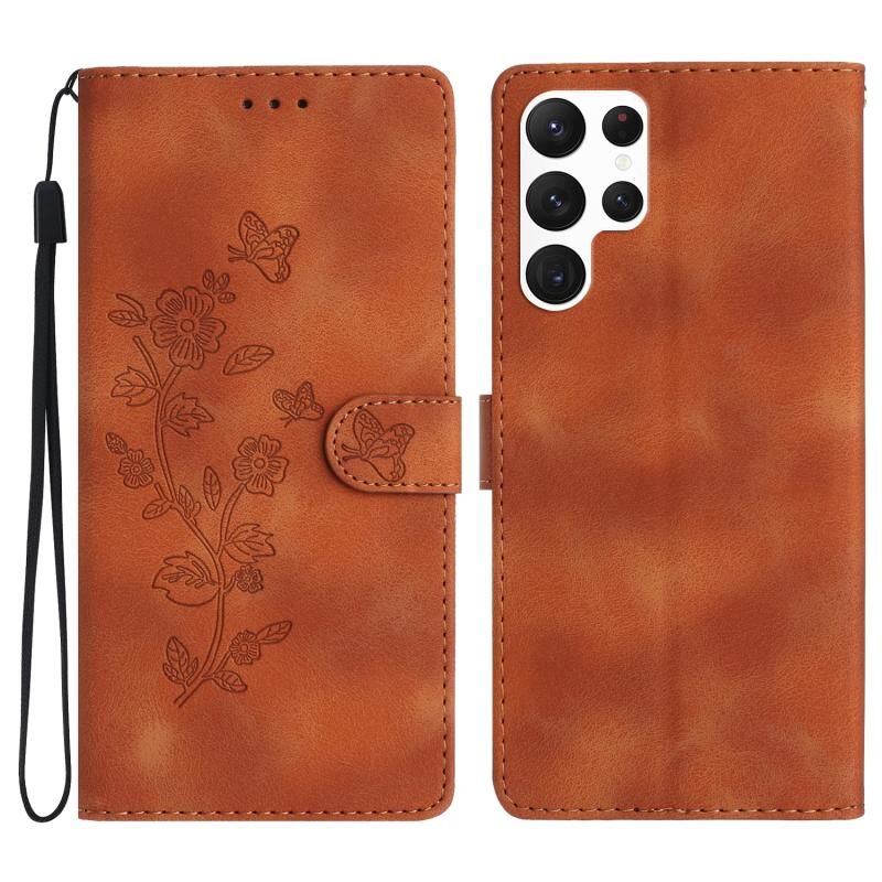 Για Samsung Galaxy S23 Ultra 5G λουλούδι πεταλούδα ανάγλυφο μοτίβο δερμάτινη θήκη τηλεφώνου (καφέ)