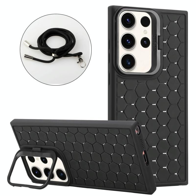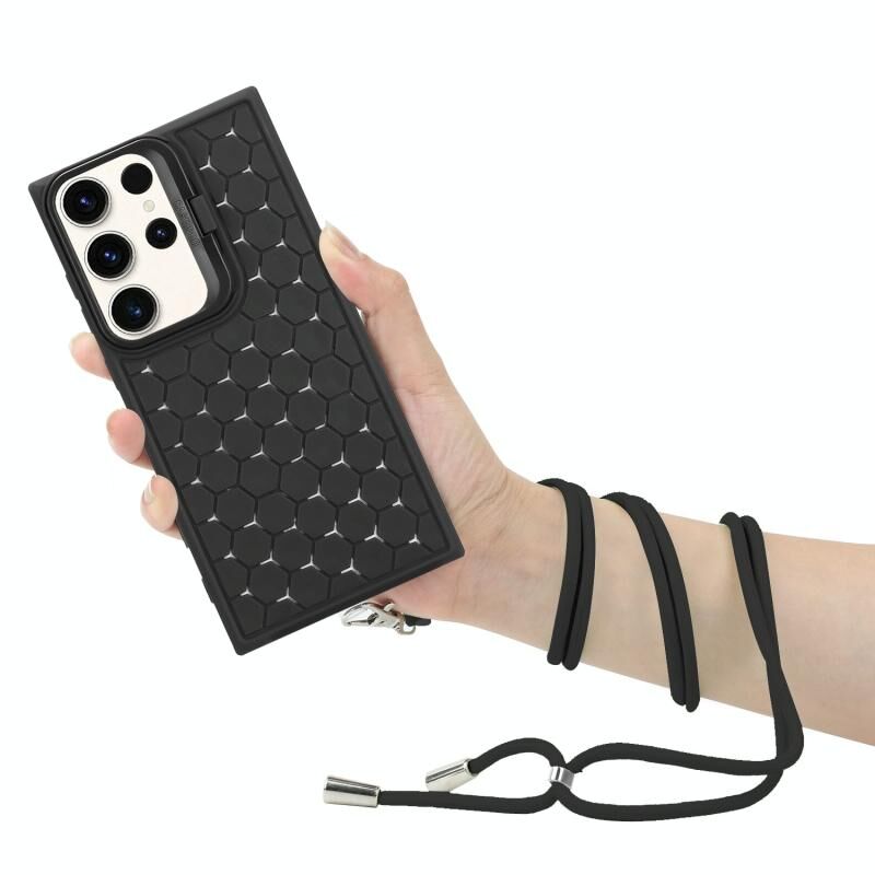 Για το Samsung Galaxy S23 Ultra 5G κηρήθρα ακτινοβολία κάτοχος TPU τηλέφωνο υπόθεση με κορδόνι (μαύρο)