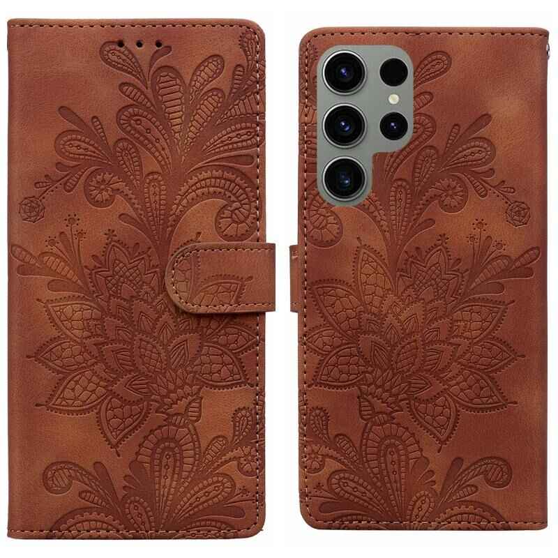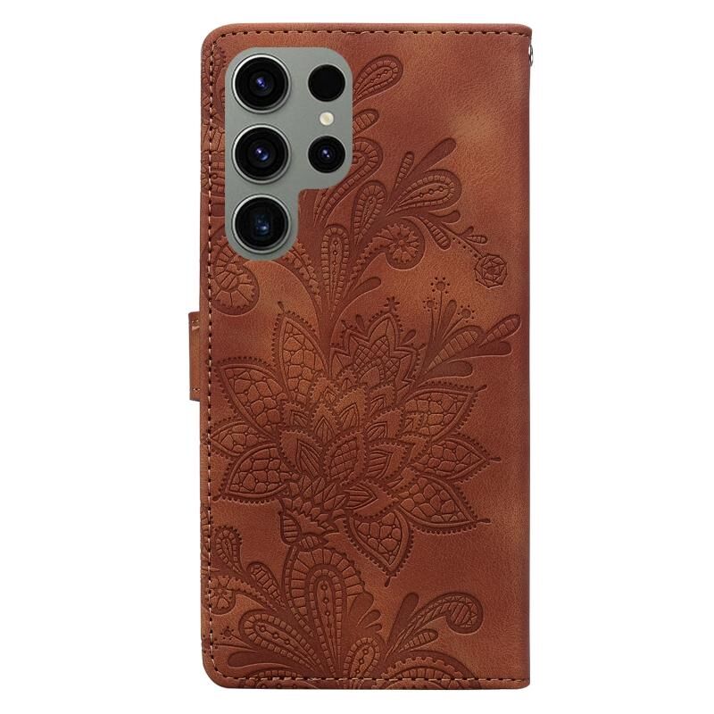 Θήκη κινητού τηλεφώνου Samsung Galaxy S23 Ultra 5G από PU με δαντελένιο λουλουδάτο ανάγλυφο και μαγνητικό κούμπωμα, με λουρί καρπού (Πράσινο)