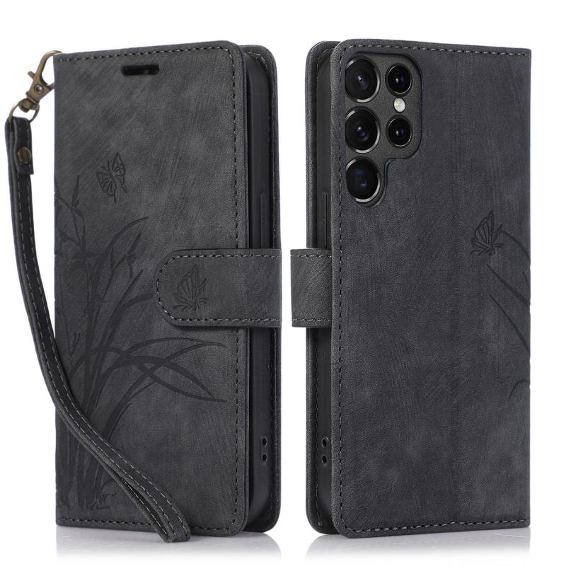 For Samsung Galaxy S23 Ultra 5G Orchid Butterfly Embossed Leather Phone Case(Black)
