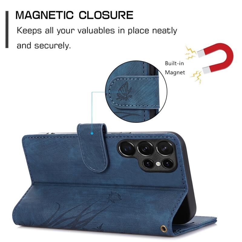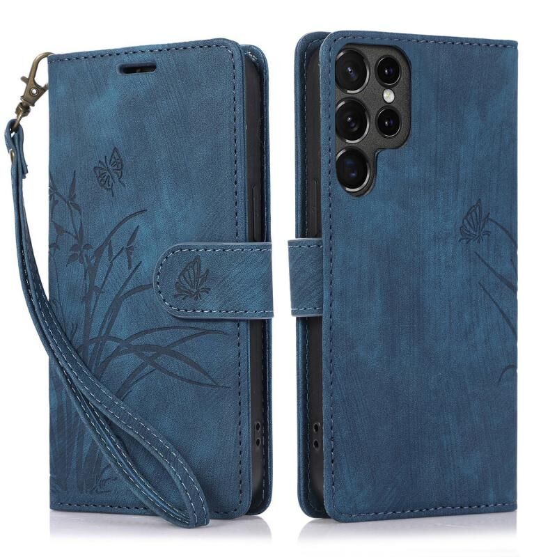 For Samsung Galaxy S23 Ultra 5G Orchid Butterfly Embossed Leather Phone Case(Blue)