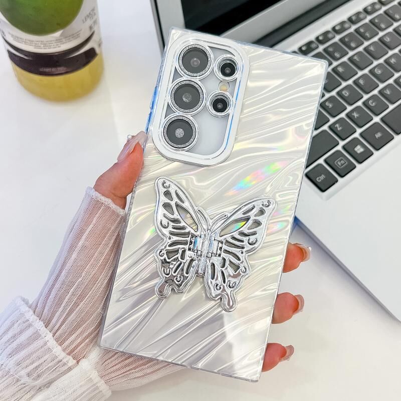 For Samsung Galaxy S23 Ultra 5G Plating Glitter Texture Butterfly Holder TPU Phone Case with Lens Film(White Water Ripples)