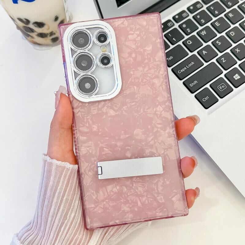 Για Samsung Galaxy S23 Ultra 5G επιμετάλλωση Glitter υφή Πτυσσόμενα κάτοχος TPU τηλέφωνο υπόθεση με φακό ταινία (ροζ Shell μοτίβο)