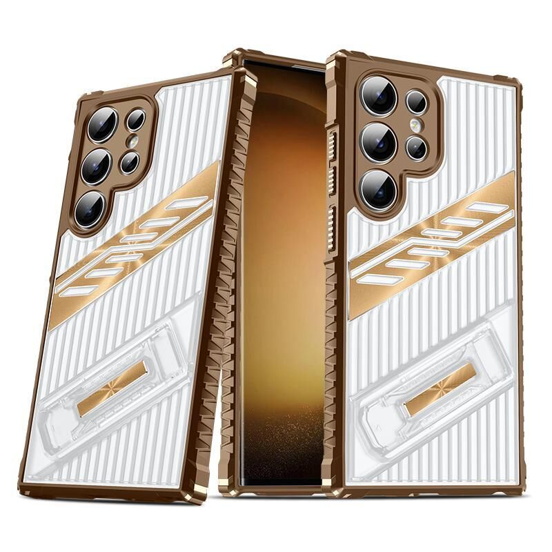 For Samsung Galaxy S23 Ultra 5G Plating Holder PC Hybrid TPU Phone Case(Desert Gold)