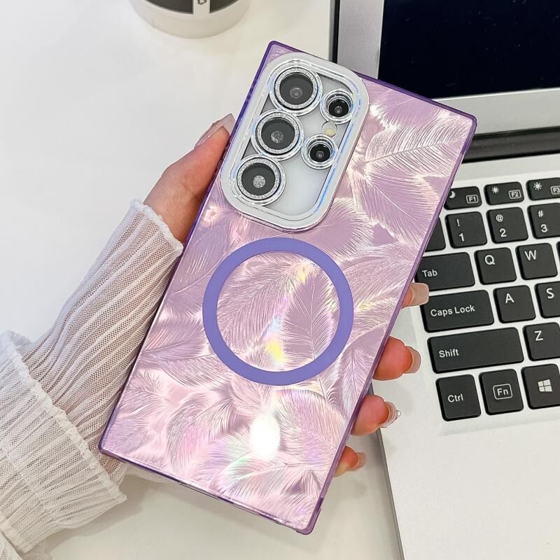 Θήκη κινητού τηλεφώνου Samsung Galaxy S23 Ultra 5G με επιμετάλλωση, υφή MagSafe, TPU και μεμβράνη φακού με γκλίτερ (Μωβ Φτερά)