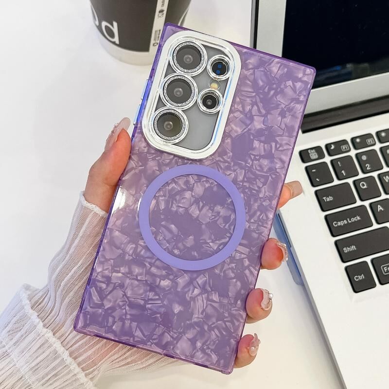 Θήκη κινητού τηλεφώνου Samsung Galaxy S23 Ultra 5G με επιμετάλλωση, υφή MagSafe, TPU και μεμβράνη φακού με γκλίτερ (Μωβ σχέδιο κοχυλιού)