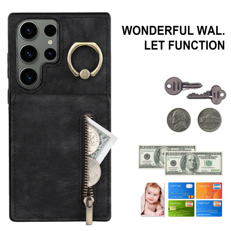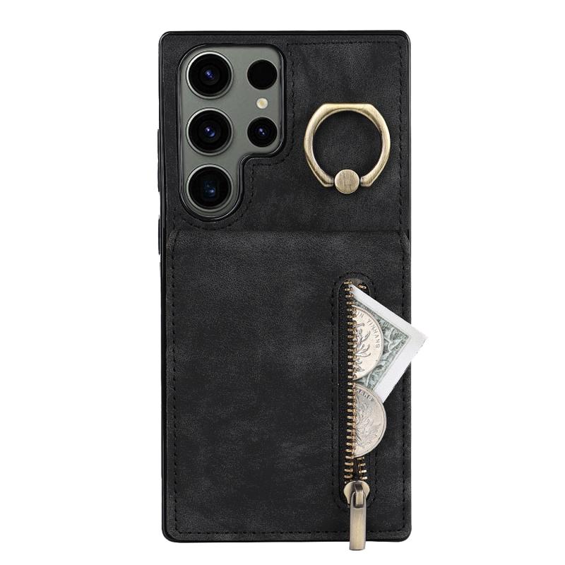 Θήκη κινητού τηλεφώνου Samsung Galaxy S23 Ultra 5G με ρετρό δακτύλιο και θήκη κάρτας RFID με φερμουάρ (Μαύρο)