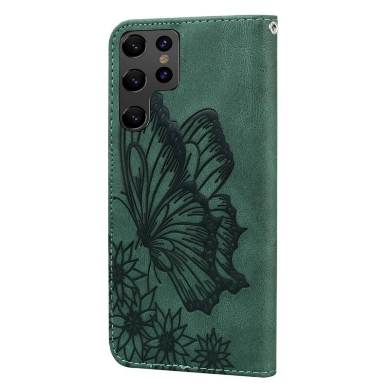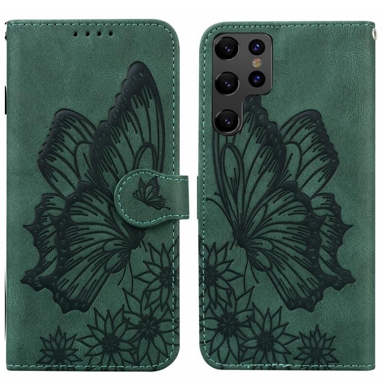 Θήκη τηλεφώνου Samsung Galaxy S23 Ultra 5G, δερμάτινη, οριζόντια, με ανάγλυφα σχέδια πεταλούδων και ρετρό υφή (Μαύρο)