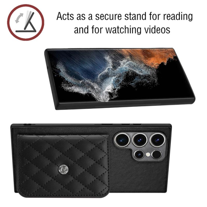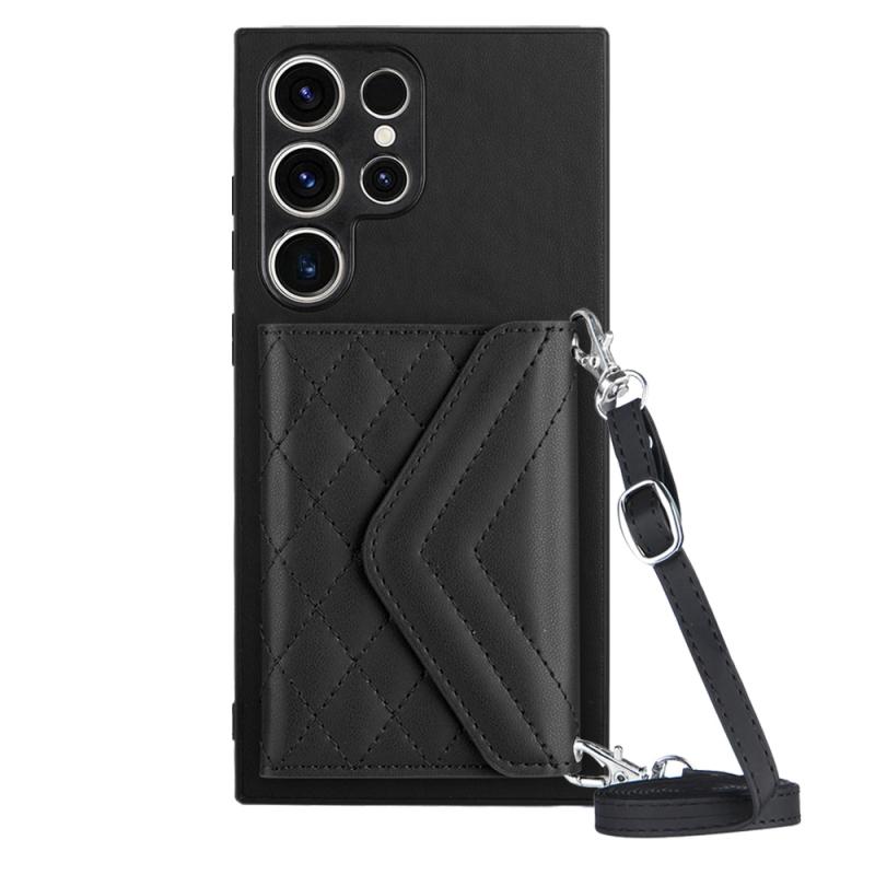 For Samsung Galaxy S23 Ultra 5G Rhombic Texture Card Bag RFID Phone Case with Long Lanyard(Black)