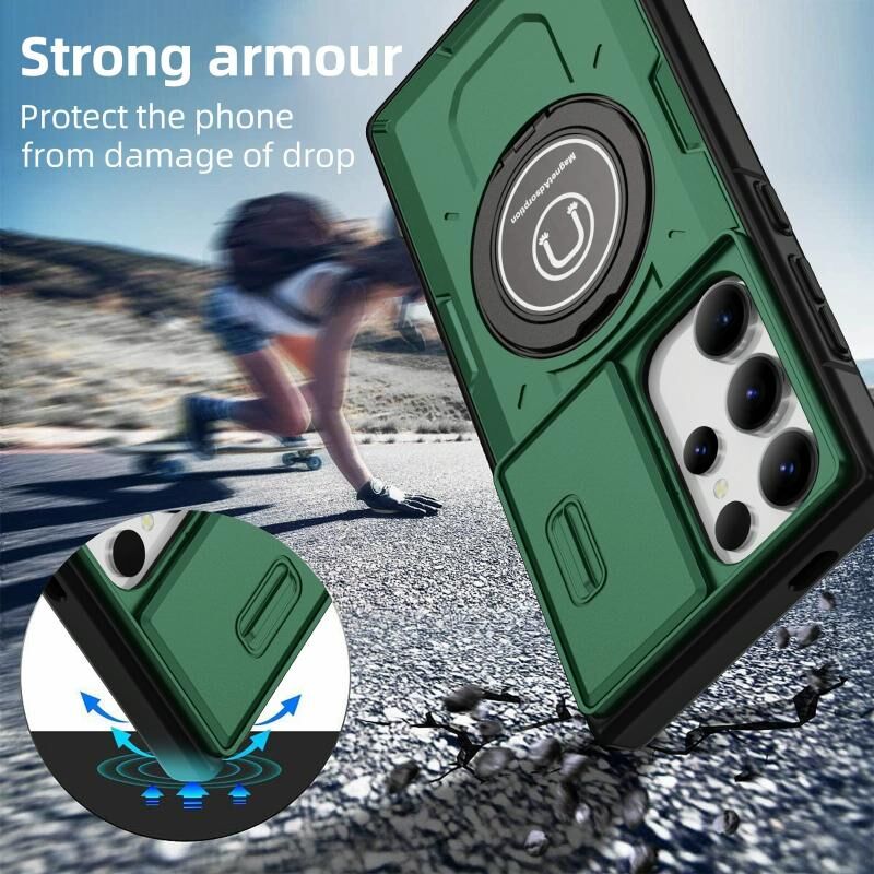 Για Samsung Galaxy S23 Ultra 5G συρόμενη Camshield TPU υβριδικό PC μαγνητική θήκη τηλέφωνο κάτοχος (σκούρο πράσινο)