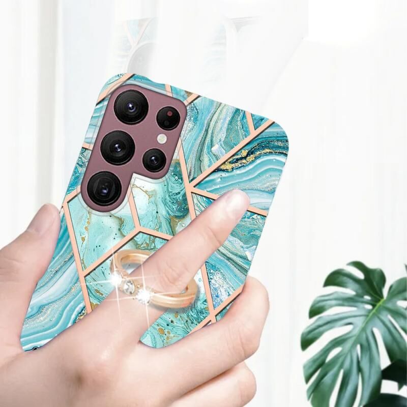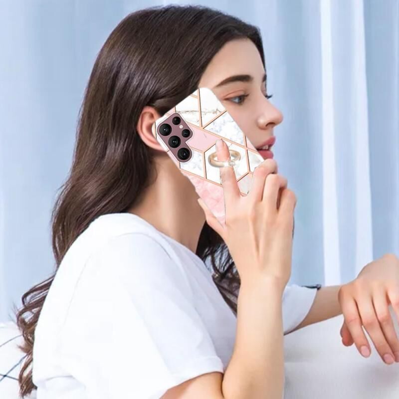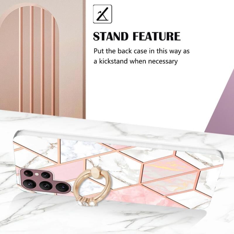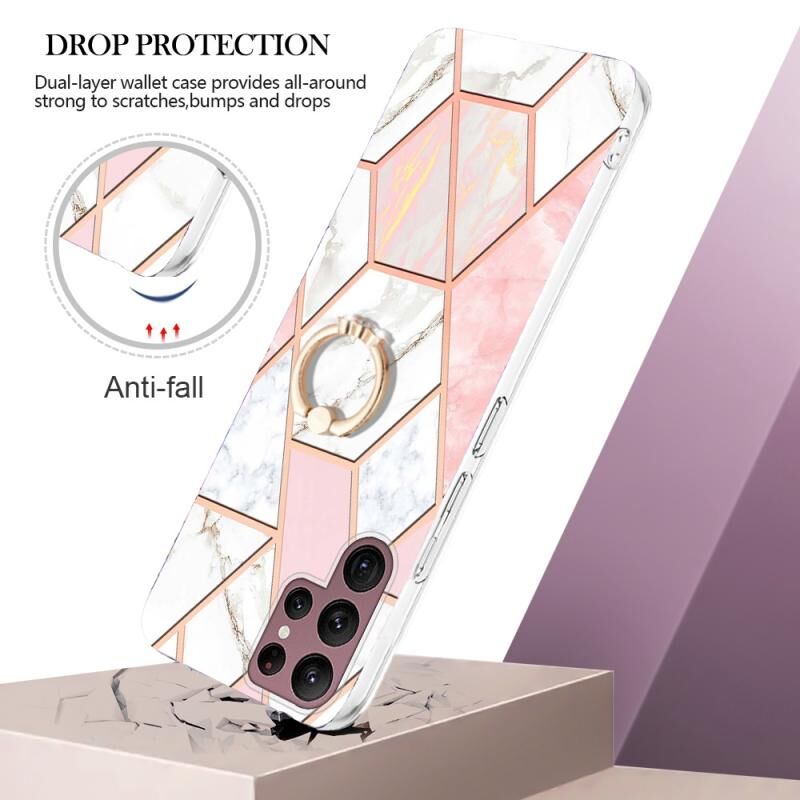 Θήκη κινητού τηλεφώνου Samsung Galaxy S23 Ultra 5G, με σχέδιο μαρμάρου και λουλουδιών, IMD TPU, με δακτύλιο στήριξης (Σκούρο Μωβ)