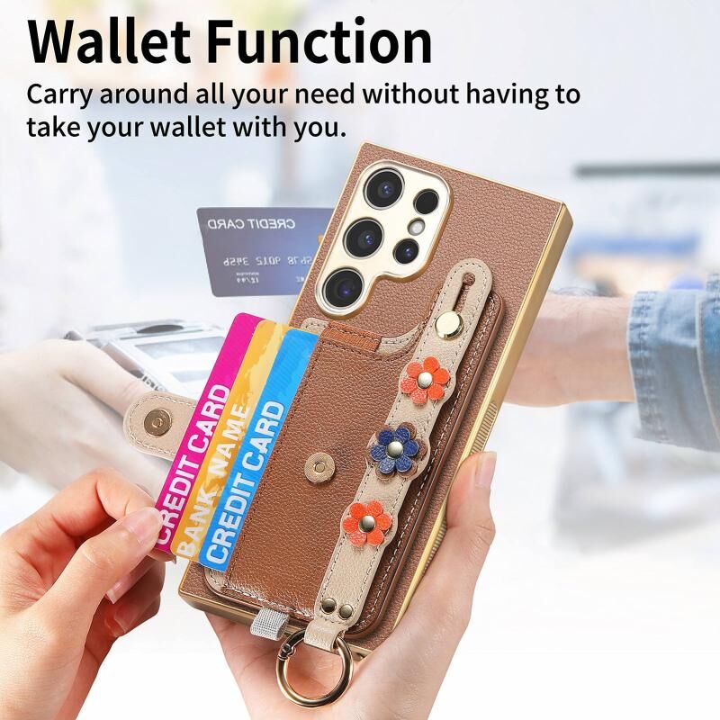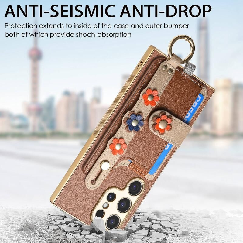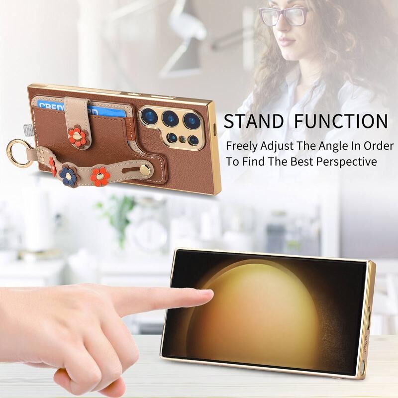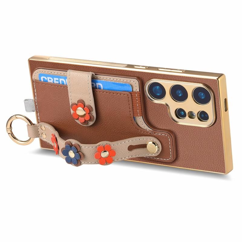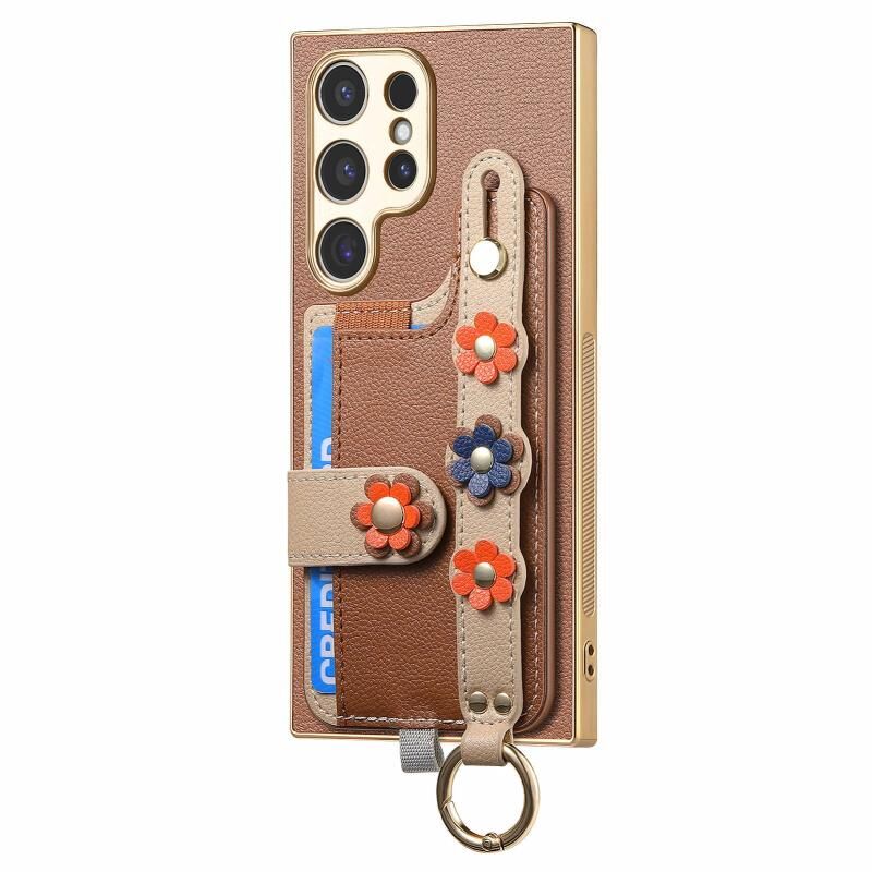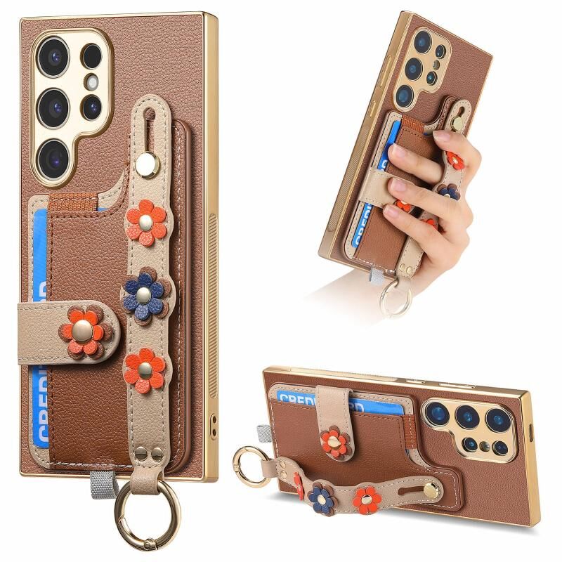 Για Samsung Galaxy S23 Ultra 5G Στερεοσκοπική λουλούδια Wristband κάρτα τσάντα υπόθεση τηλεφώνου (καφέ)