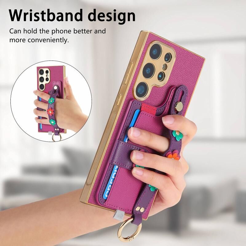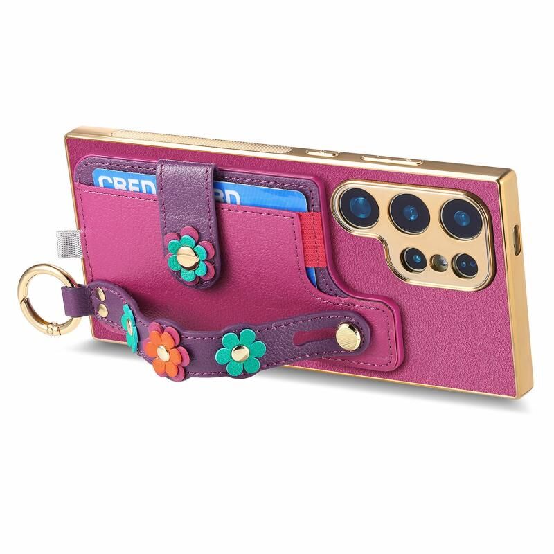 Για Samsung Galaxy S23 Ultra 5G Στερεοσκοπική λουλούδια Wristband κάρτα τσάντα υπόθεση τηλεφώνου (μωβ)