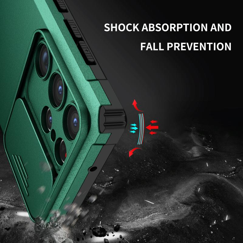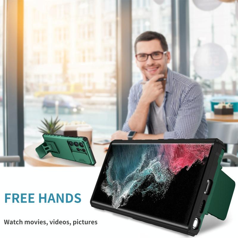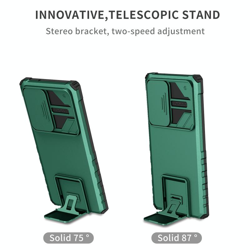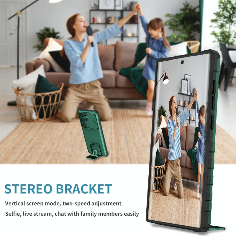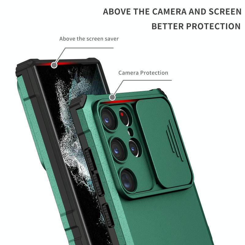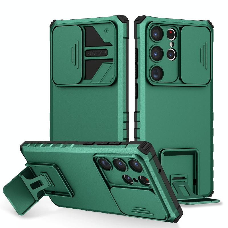 Θήκη τηλεφώνου για Samsung Galaxy S23 Ultra 5G με στερεοσκοπική βάση και συρόμενο προστατευτικό κάμερας (Σκούρο πράσινο)
