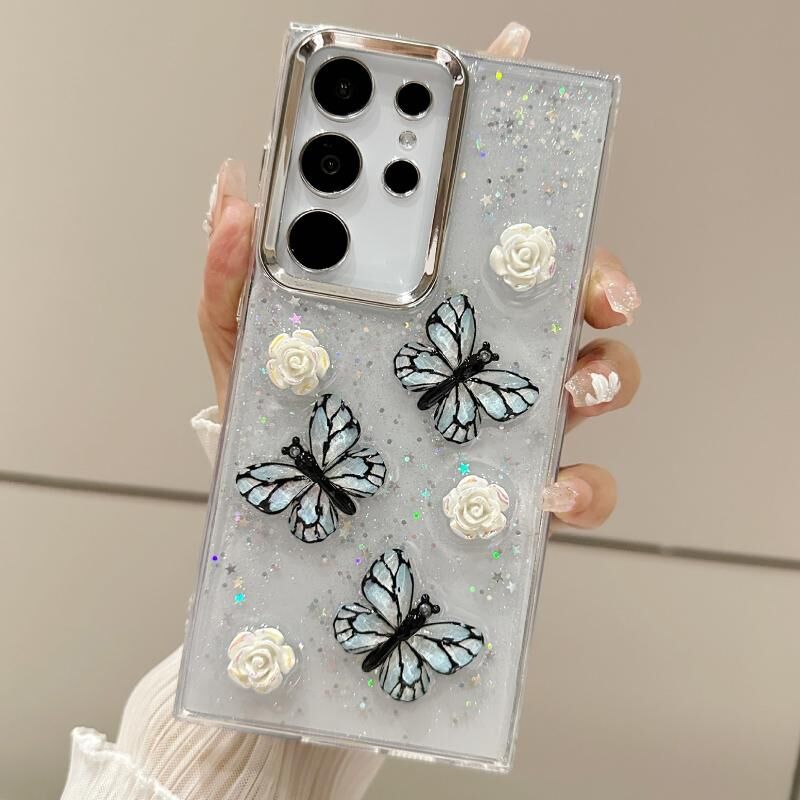 Θήκη κινητού τηλεφώνου TPU με τρισδιάστατη πεταλούδα και γκλίτερ για Samsung Galaxy S23 Ultra 5G (Μπλε)