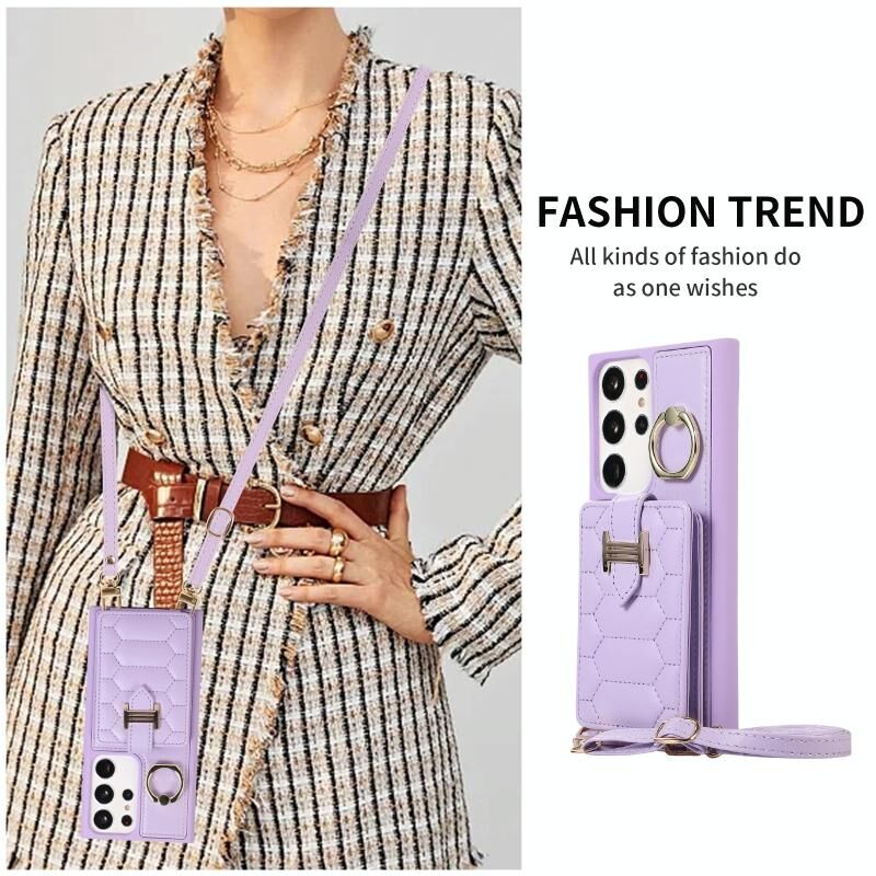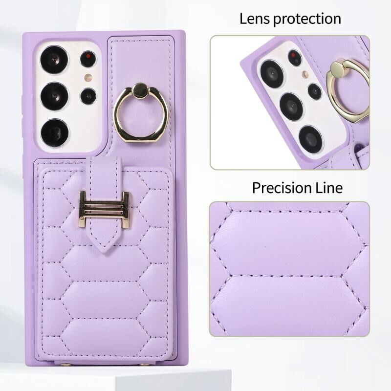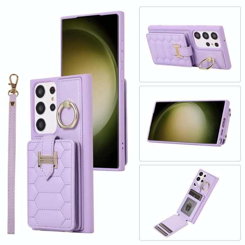 Για Samsung Galaxy S23 Ultra 5G Κάθετη κάρτα τσάντα δαχτυλίδι τσάντα κάτοχος υπόθεση τηλεφώνου με διπλή κορδόνι (μωβ)