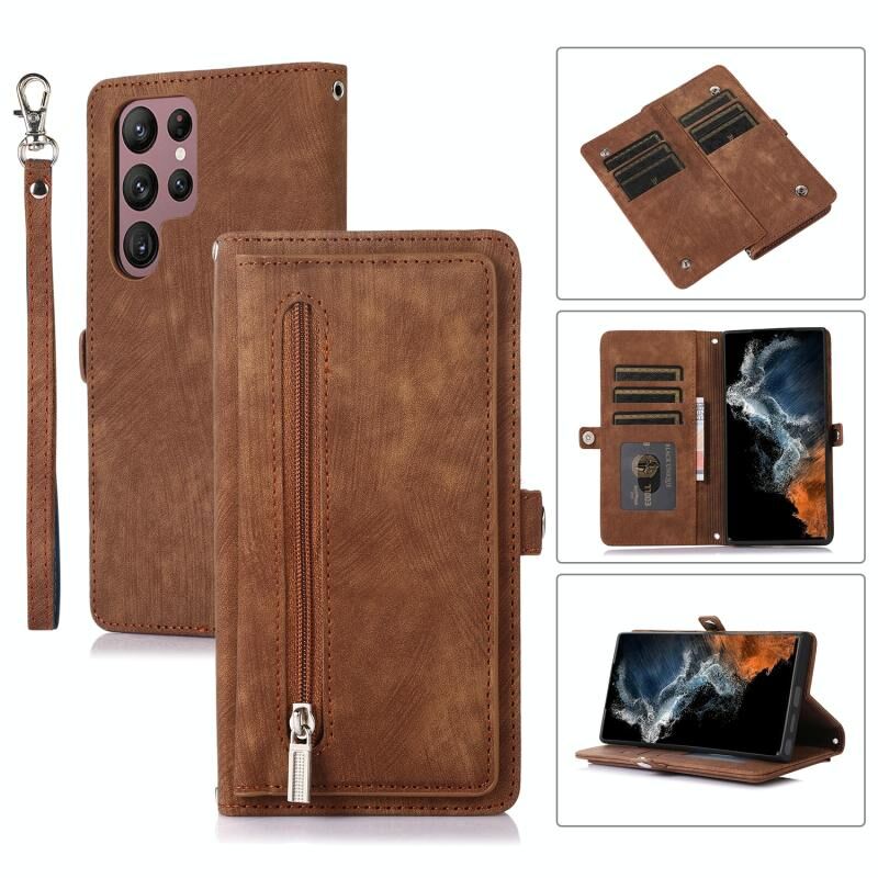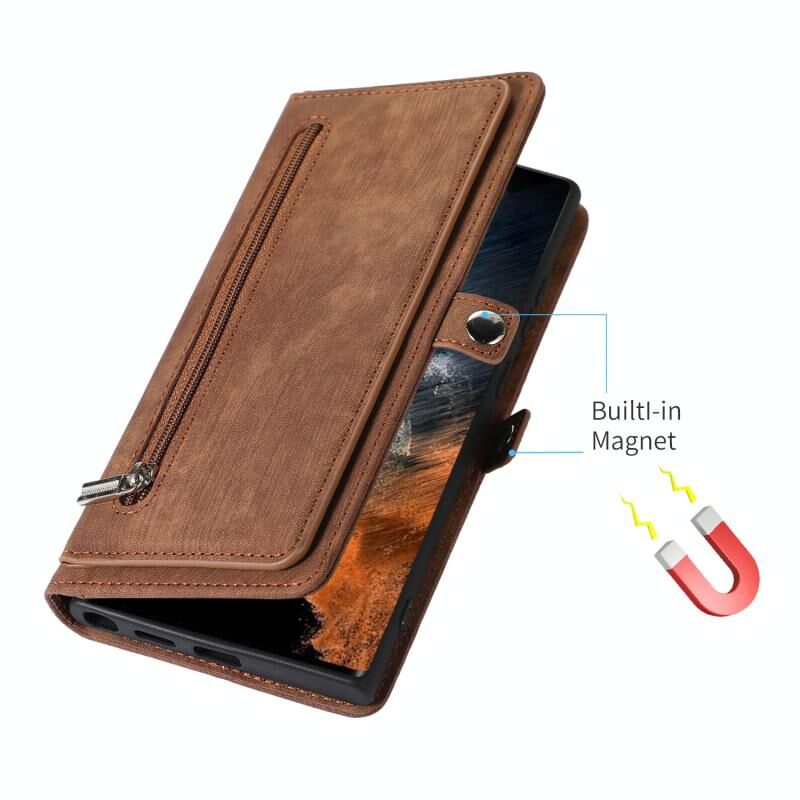 Για Samsung Galaxy S23 Ultra 5G φερμουάρ κάρτα Slot πόρπη πορτοφόλι δερμάτινη θήκη τηλεφώνου (καφέ)