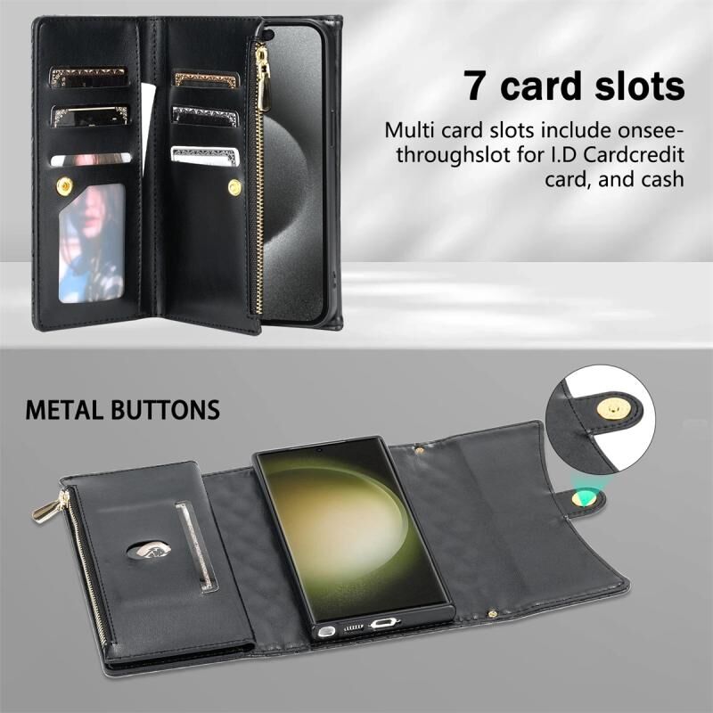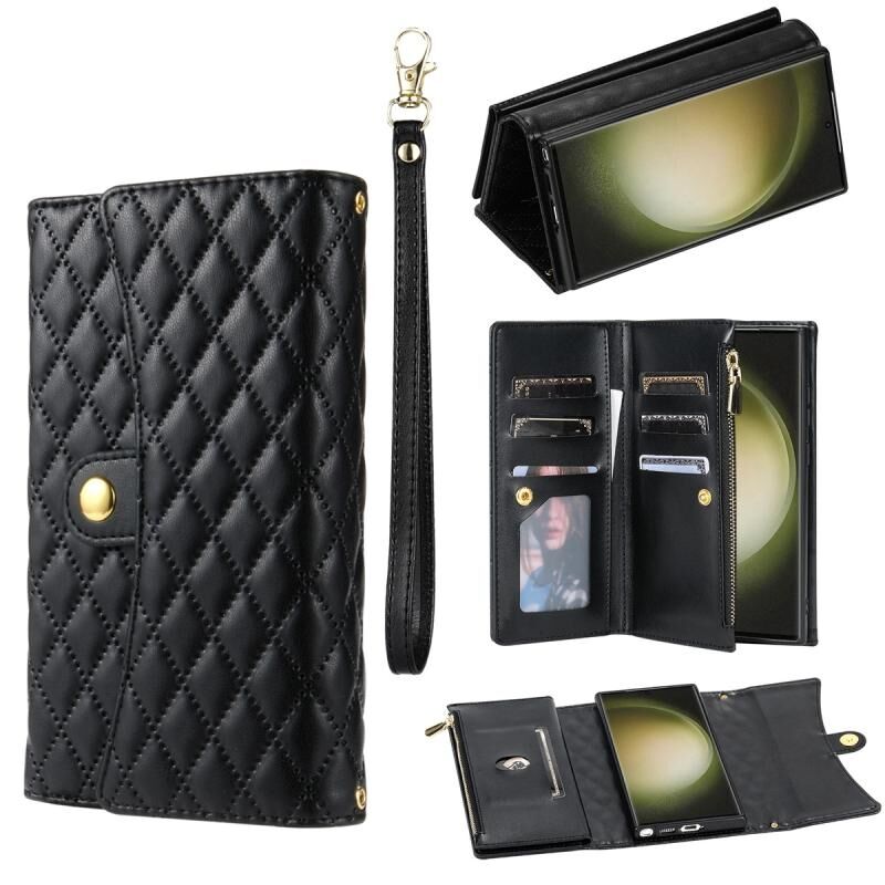 Για το Samsung Galaxy S23 Ultra 5G φερμουάρ πολλαπλών καρτών πορτοφόλι ρομβοειδή δερμάτινη θήκη τηλεφώνου (μαύρο)