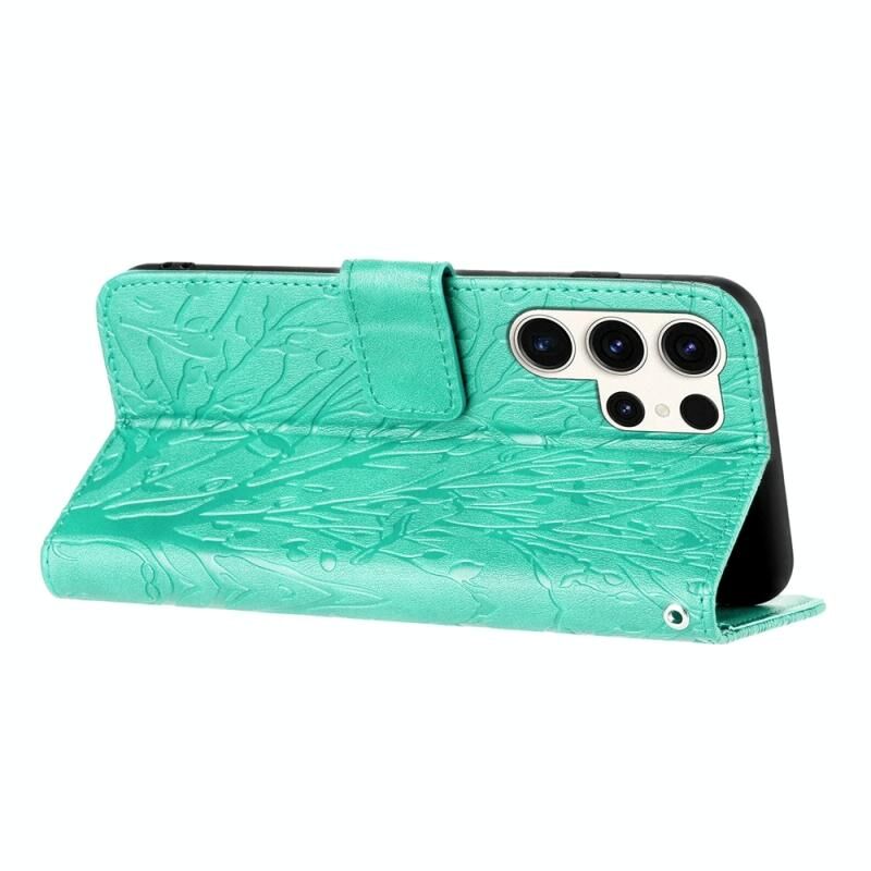 For Samsung Galaxy S23 Ultra Tree Birds Embossed Pattern Leather Phone Case(Green)