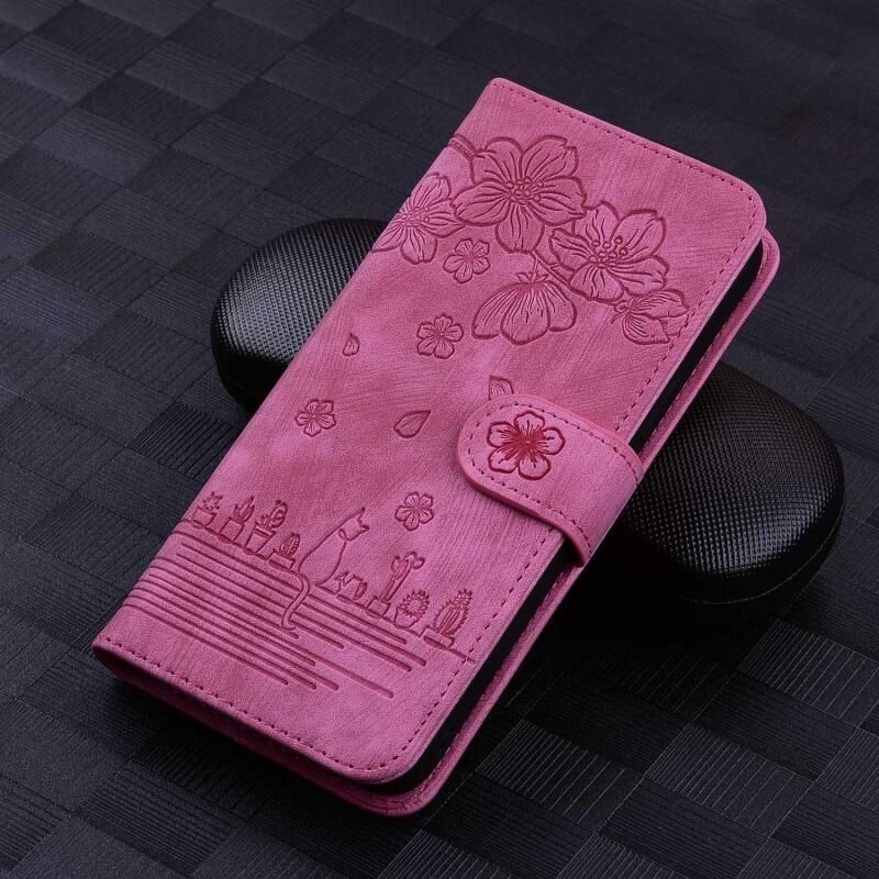 For Samsung Galaxy S24 5G Cartoon Sakura Cat Embossed Leather Phone Case(Rose Red)