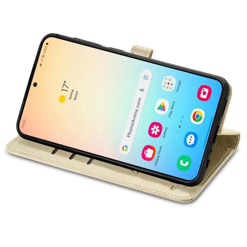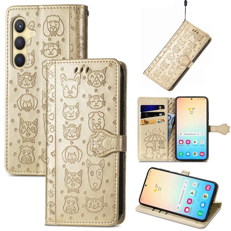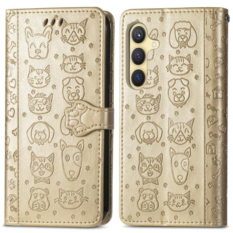 Θήκη τηλεφώνου Samsung Galaxy S24+ 5G από δέρμα με ανάγλυφο σχέδιο γάτας και σκύλου (Χρυσός)