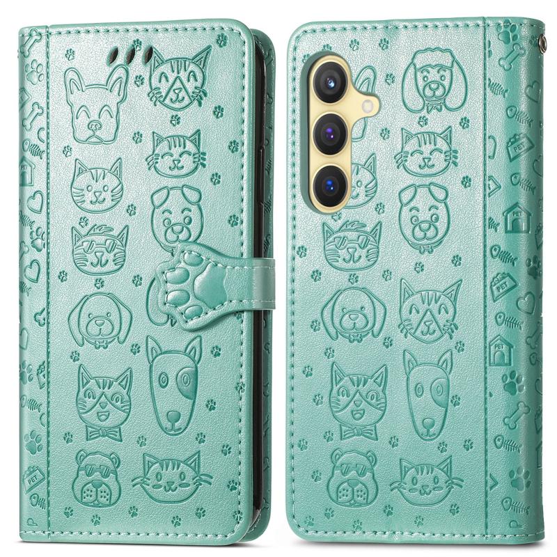 For Samsung Galaxy S24 5G Cat and Dog Embossed Leather Phone Case(Green)