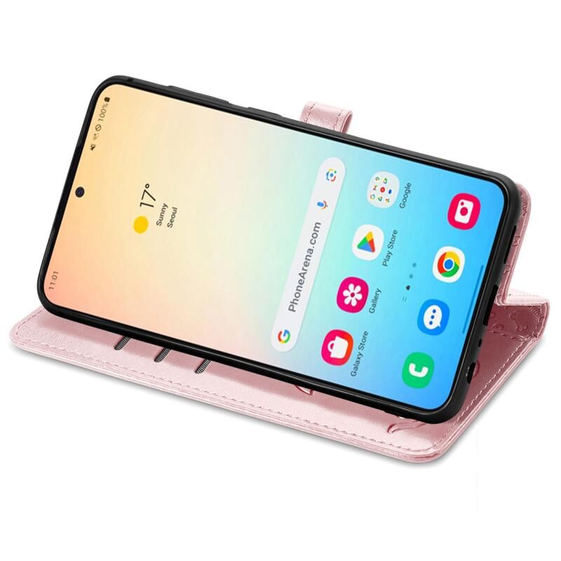 Θήκη τηλεφώνου Samsung Galaxy S24+ 5G από δέρμα με ανάγλυφο σχέδιο γάτας και σκύλου (Ροζ χρυσός)