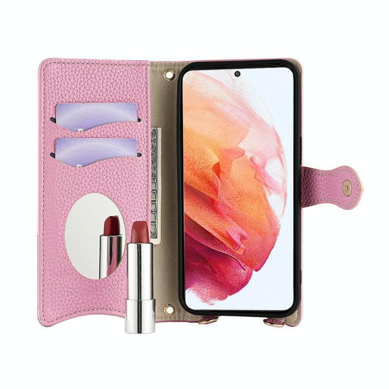 7. Built-in Oval Stainless Steel Makeup Mirror: A durable, scratch-resistant oval mirror inside the phone case for easy makeup touch-ups on the go.