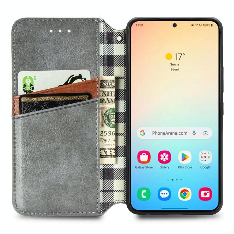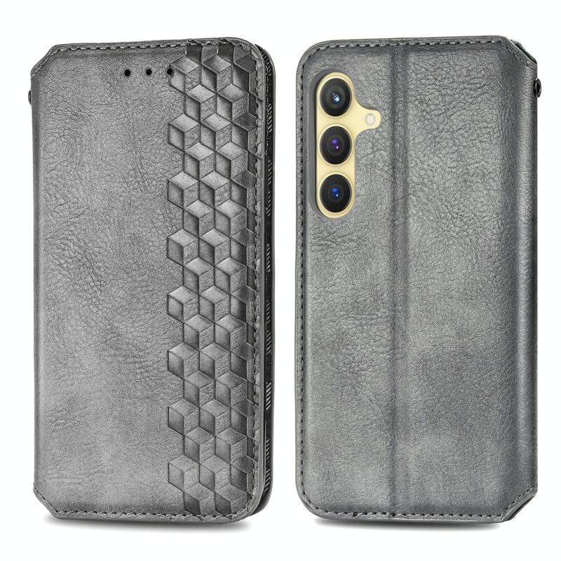 Για Samsung Galaxy S24 5G κυβικό πλέγμα πρεσαριστή μαγνητική δερμάτινη θήκη τηλεφώνου (γκρι)