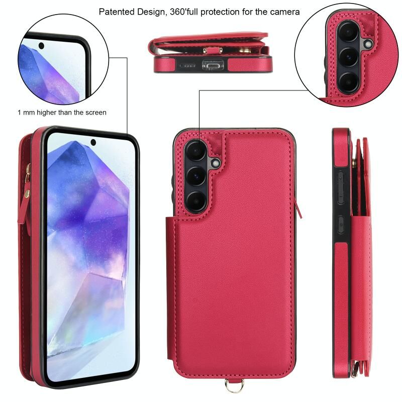 Θήκη τηλεφώνου Samsung Galaxy S24+ 5G από δέρμα με διπλό φερμουάρ και RFID, με κοντό κορδόνι (Κόκκινο)
