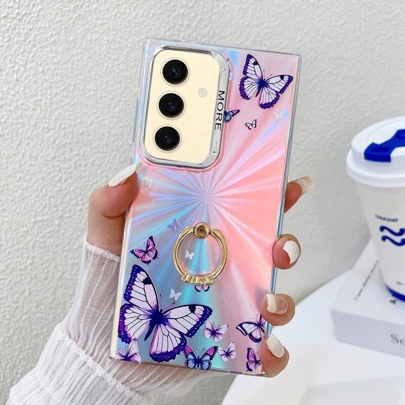 Θήκη τηλεφώνου για Samsung Galaxy S24+ 5G με Ηλεκτρολυτική Επικάλυψη, Λασερ, Πεταλούδες και Δαχτυλίδι Στήριξης (Ροζ Πεταλούδες AB2)
