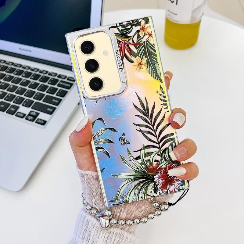 Θήκη τηλεφώνου Samsung Galaxy S24 5G με ηλεκτρολυτική επίστρωση, λουλούδι λέιζερ και λουρί καρπού (Φύλλα AH12)