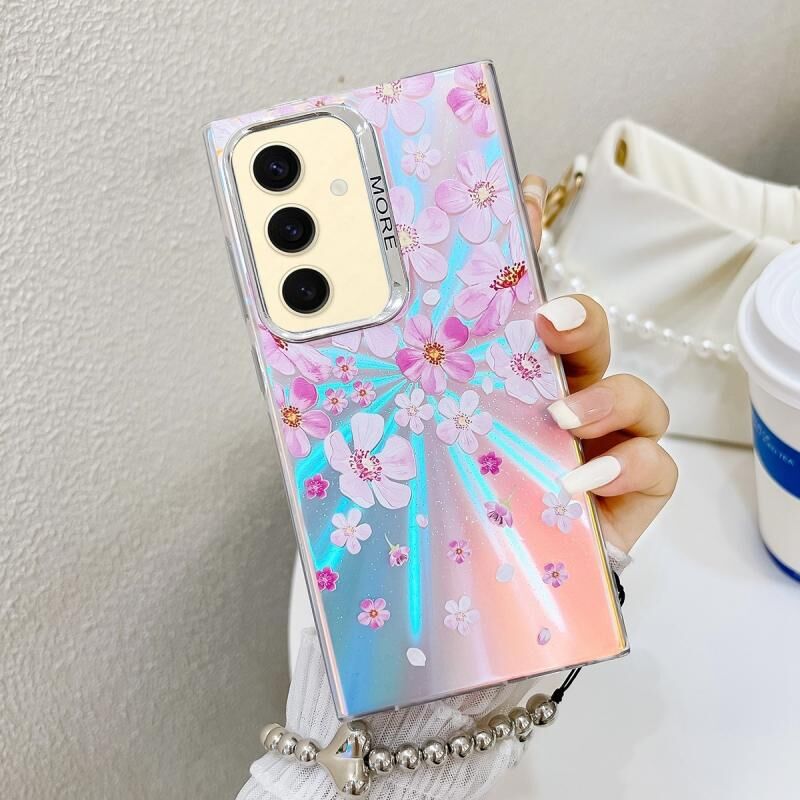Θήκη τηλεφώνου για Samsung Galaxy S24+ 5G με ηλεκτρολυτική επίστρωση, λουλούδι με λέιζερ και λουρί καρπού (Λευκό Λουλούδι AH10)