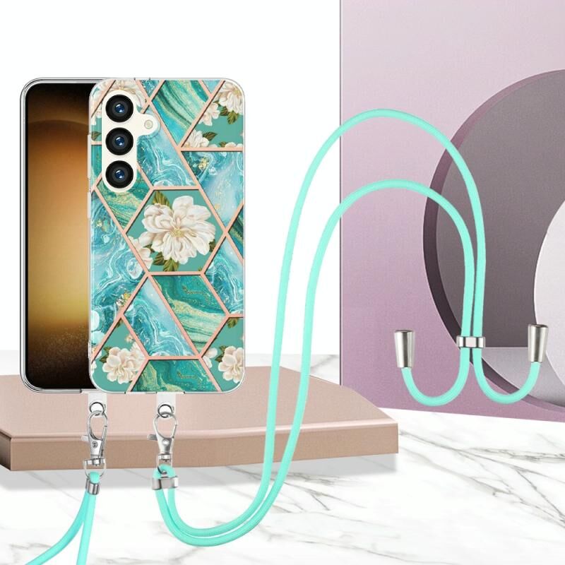 Θήκη κινητού τηλεφώνου Samsung Galaxy S24 5G με γαλβανισμό, συνδυασμό μαρμάρου, λουλούδι IMD TPU με κορδόνι (Μαύρο Λουλούδι)