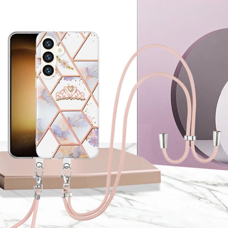 Θήκη κινητού τηλεφώνου Samsung Galaxy S24 5G με γαλβανισμό, συνδυασμό μαρμάρου, λουλούδι IMD TPU με κορδόνι (Στέμμα)