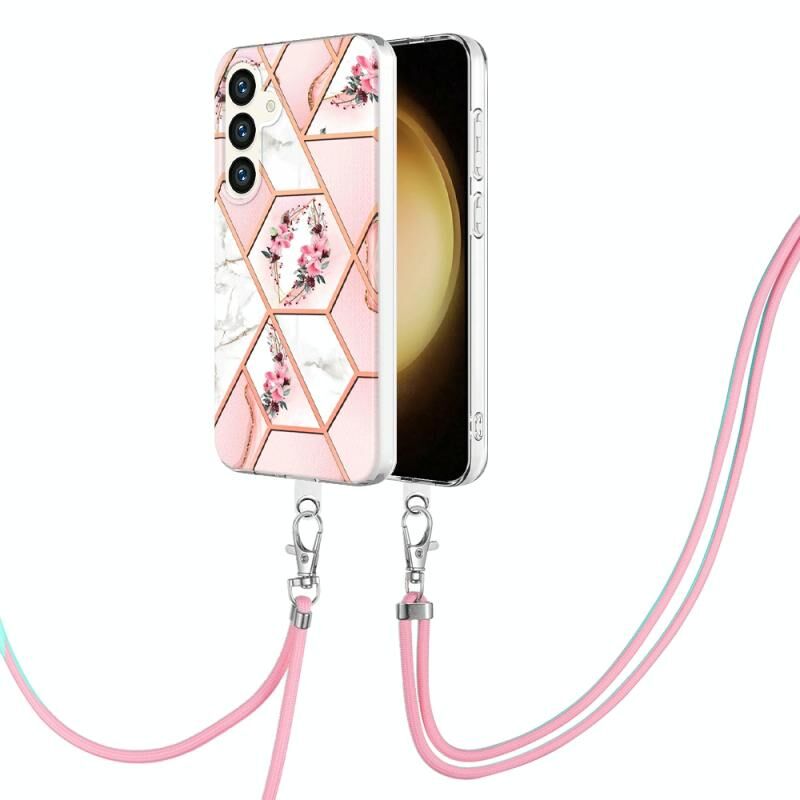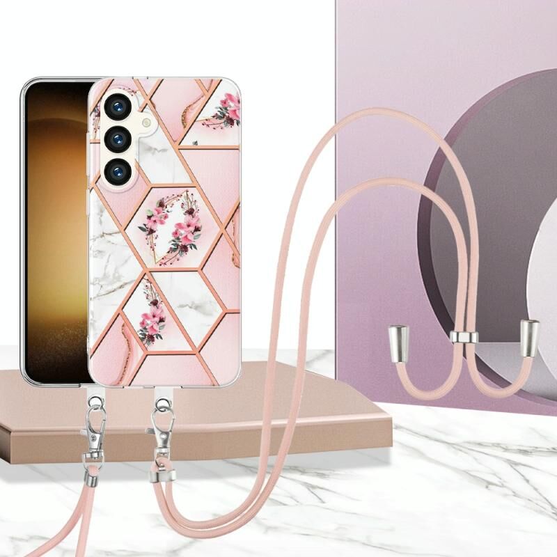 Θήκη κινητού τηλεφώνου Samsung Galaxy S24 5G με γαλβανισμό, συνδυασμό μαρμάρου, λουλούδι IMD TPU με κορδόνι (Μαύρο Λουλούδι)