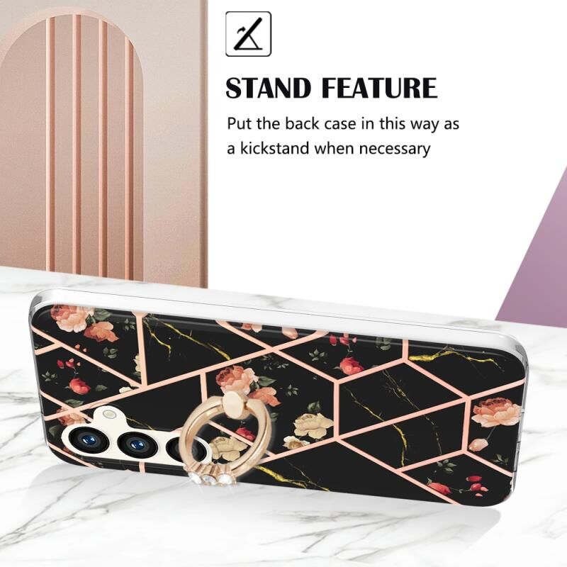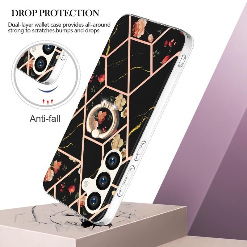Θήκη για Samsung Galaxy S24 5G με ηλεκτρολυτική επιμετάλλωση, συνδυασμό μαρμάρου και λουλουδιών, από TPU με αντικραδασμική προστασία και δαχτυλίδι στήριξης με ρητίνες (Ροζ Λουλούδι)