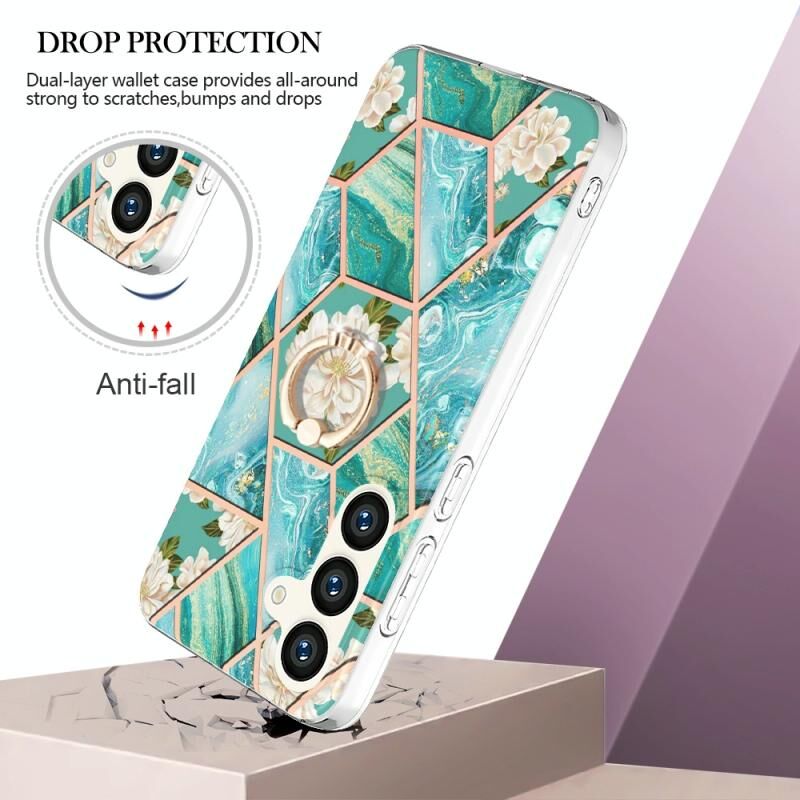 Θήκη για Samsung Galaxy S24 5G με ηλεκτρολυτική επιμετάλλωση, συνδυασμό μαρμάρου και λουλουδιών, από TPU με αντικραδασμική προστασία και δαχτυλίδι στήριξης με ρητίνες (Ροζ Λουλούδι)