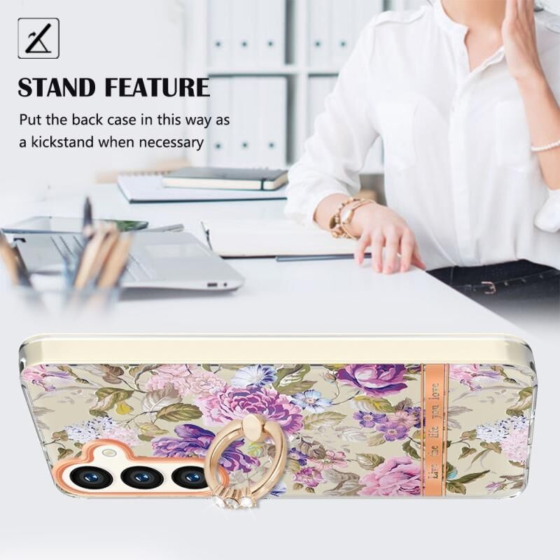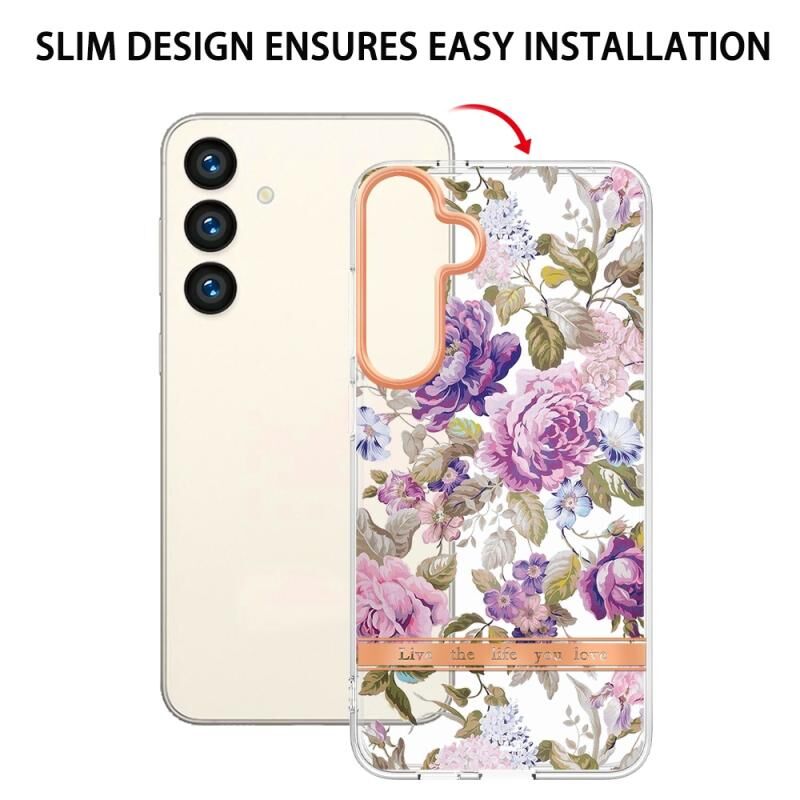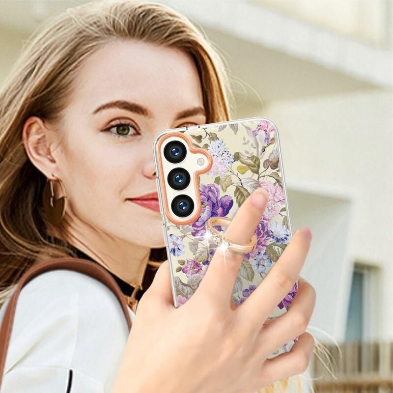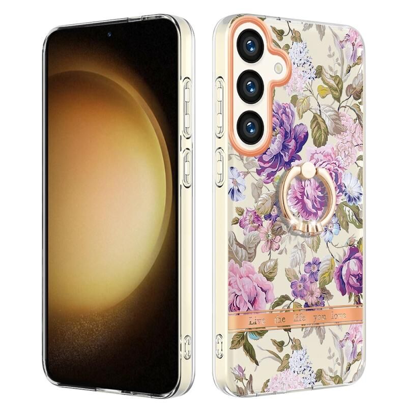 Για Samsung Galaxy S24 5G Λουλούδια και φυτά σειρά IMD TPU υπόθεση τηλεφώνου με κάτοχο δαχτυλίδι (μωβ παιώνια)