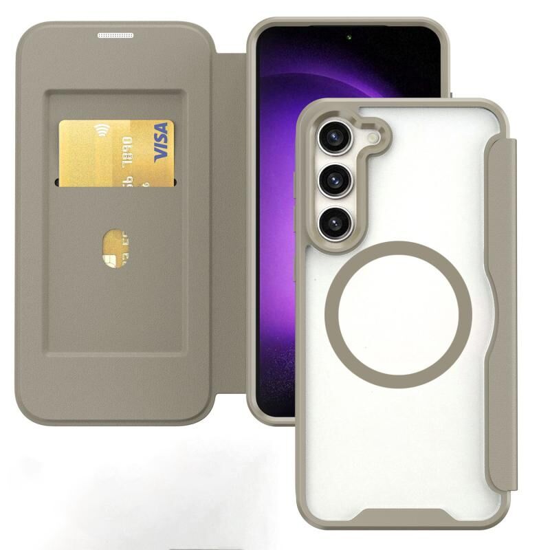 Θήκη τηλεφώνου Samsung Galaxy S24 5G MagSafe με απορρόφηση, δερμάτινη, αναδιπλούμενη, με μπλοκάρισμα RFID (Γκρι)