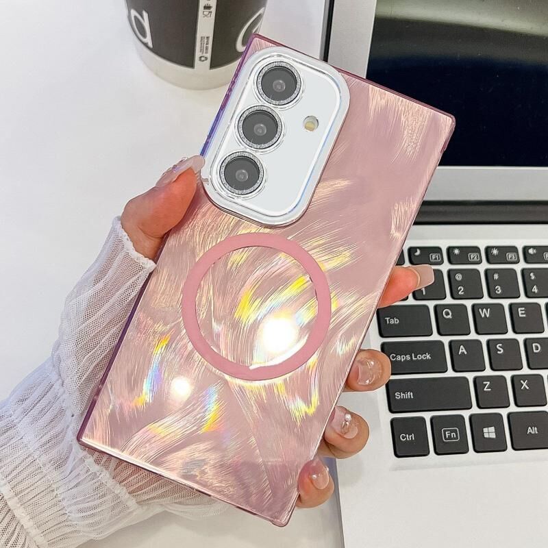 Θήκη κινητού τηλεφώνου Samsung Galaxy S24+ 5G με επιμετάλλωση, υφή MagSafe, TPU και μεμβράνη φακού με γκλίτερ (Λευκά Κύματα Νερού)