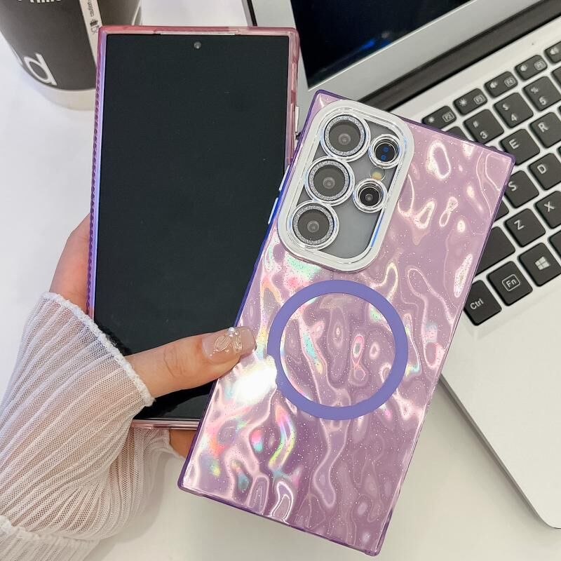 Θήκη κινητού τηλεφώνου Samsung Galaxy S24 5G με επιμετάλλωση, υφή, MagSafe, TPU και μεμβράνη φακού με γκλίτερ (Λευκά Κύματα Νερού)