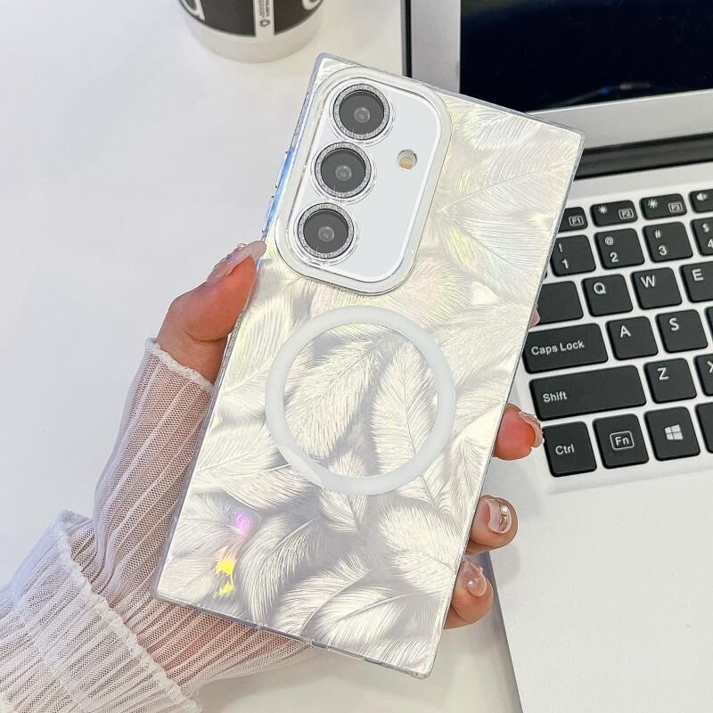 Θήκη κινητού τηλεφώνου Samsung Galaxy S24+ 5G με επιμετάλλωση, υφή MagSafe, TPU και μεμβράνη φακού με γκλίτερ (Λευκά Φτερά)