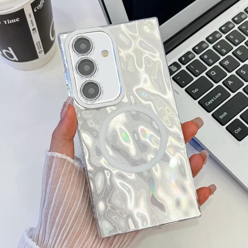 Θήκη κινητού τηλεφώνου Samsung Galaxy S24+ 5G με επιμετάλλωση, υφή MagSafe, TPU και μεμβράνη φακού με γκλίτερ (Λευκές Ρυτίδες)