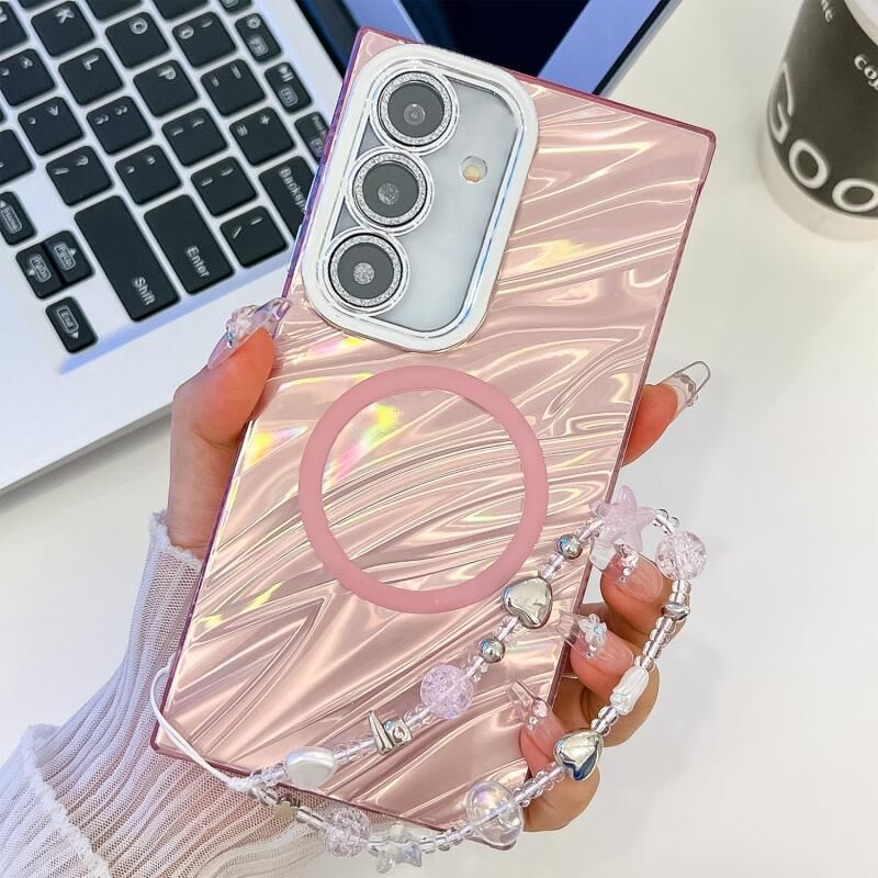 Θήκη τηλεφώνου Samsung Galaxy S24 5G με υφή επιμετάλλωσης, βραχιόλι, MagSafe, TPU και μεμβράνη φακού με γκλίτερ (Λευκά Κύματα Νερού)