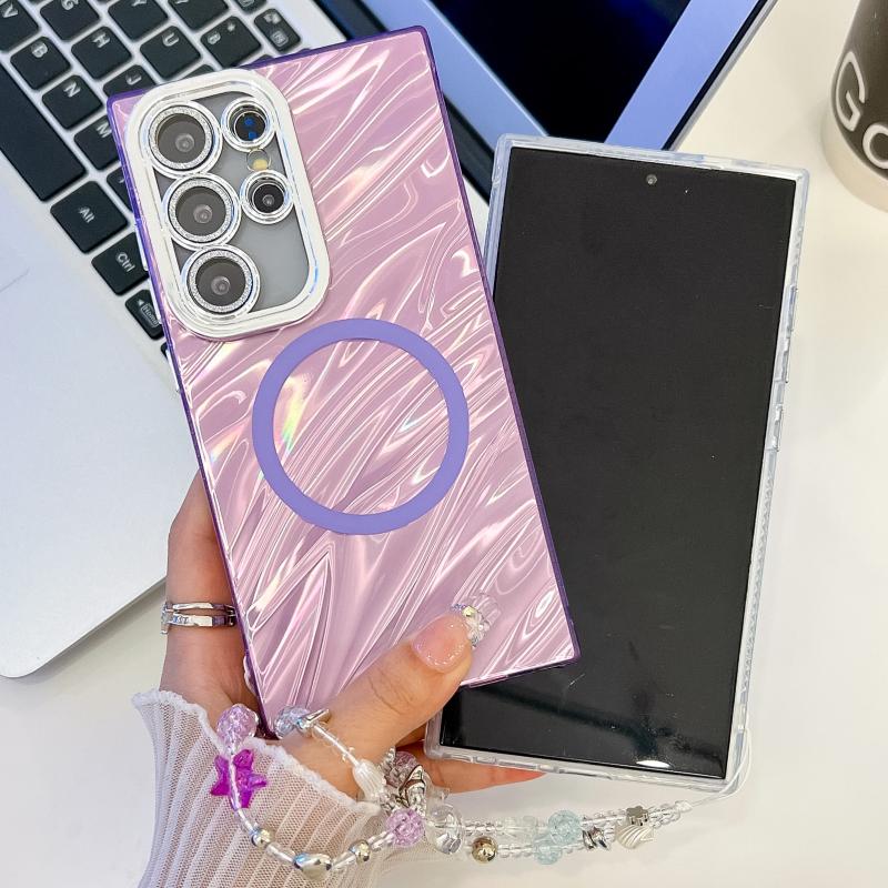 For Samsung Galaxy S24 5G Plating Texture Wristband MagSafe TPU Phone Case with Glitter Lens Film(Purple Feathers)