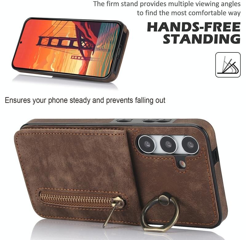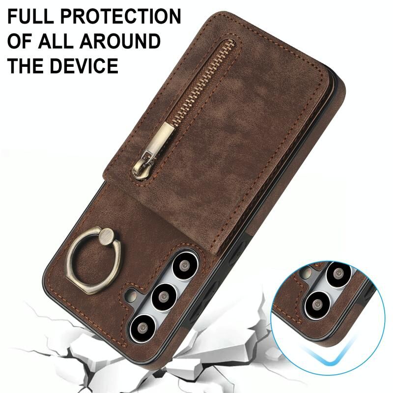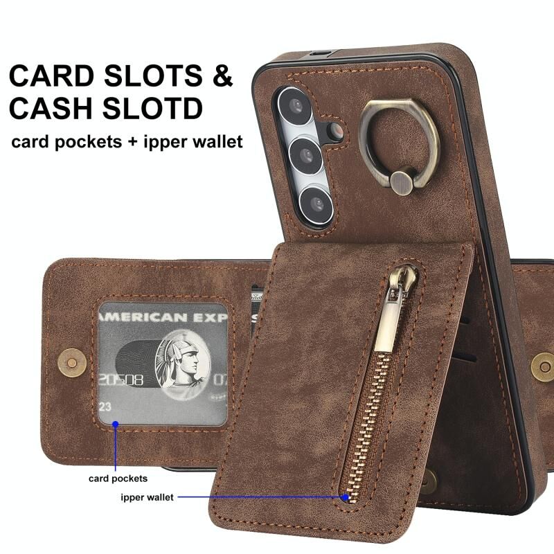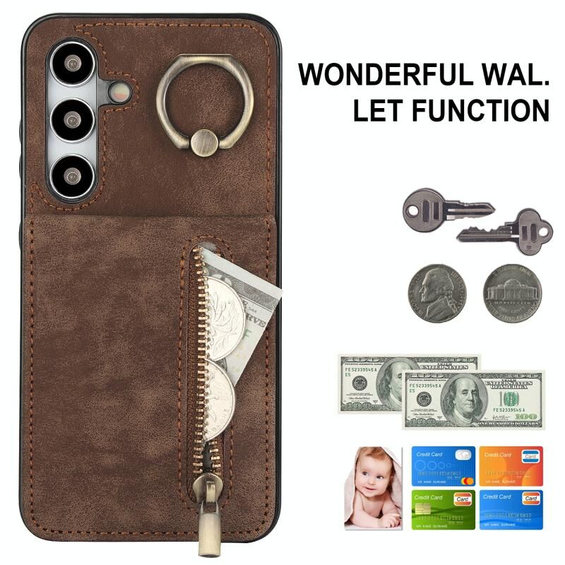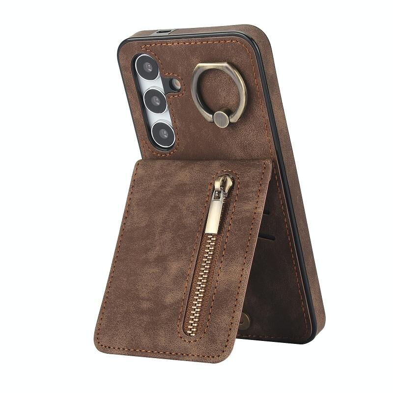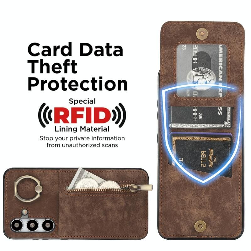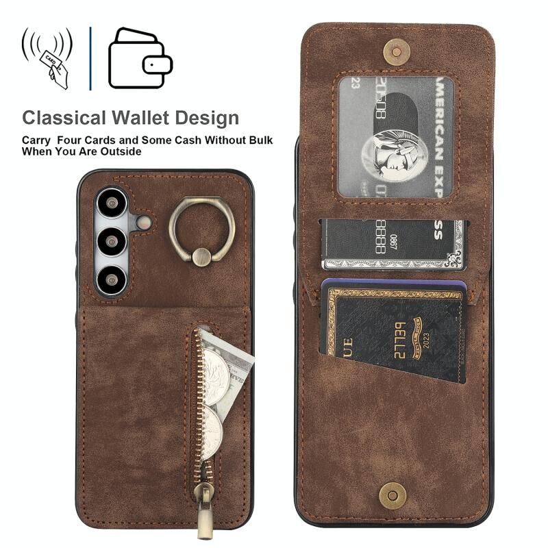 Για Samsung Galaxy S24 + 5G Ρετρό δαχτυλίδι και φερμουάρ RFID υποδοχή κάρτας υπόθεση τηλεφώνου (Καφέ)