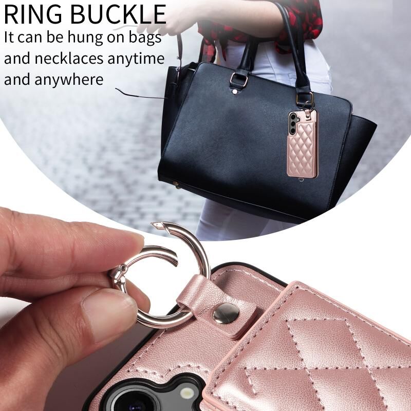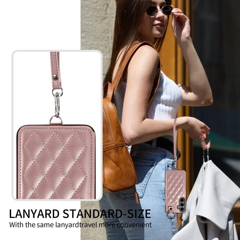 Για Samsung Galaxy S24 + 5G Rhombic υφή κάρτα τσάντα υπόθεση τηλεφώνου με σύντομο κορδόνι (ροζ χρυσό)
