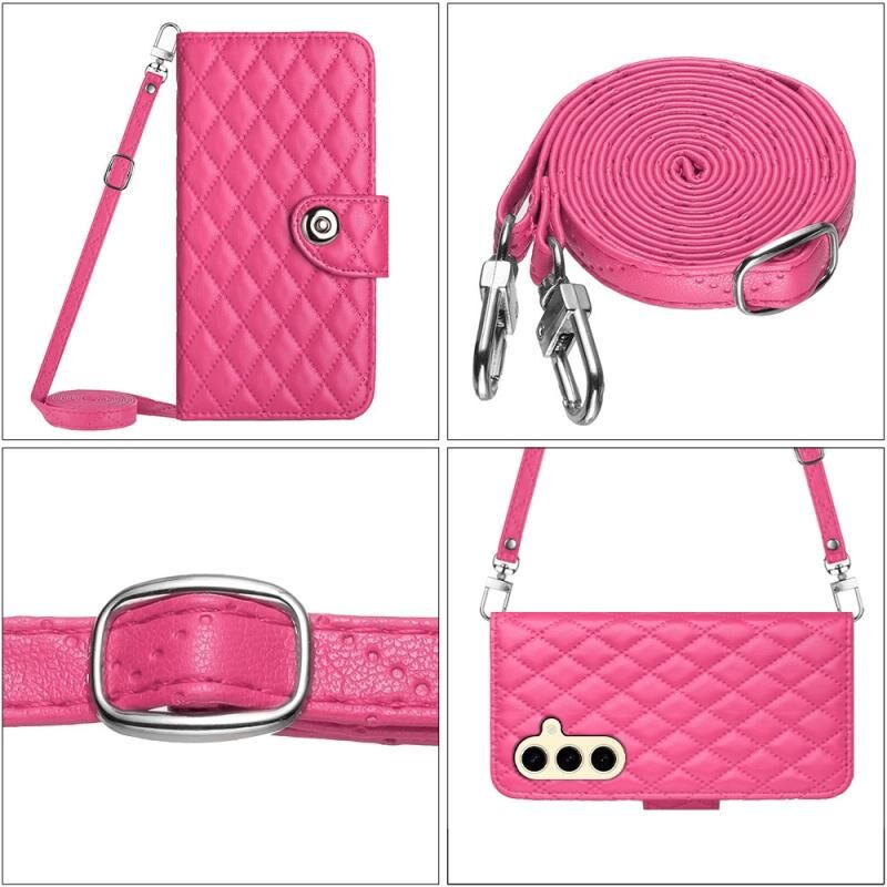 Για Samsung Galaxy S24 5G Rhombic υφή Flip δερμάτινη θήκη τηλεφώνου με μακρύ κορδόνι (Rose Red)