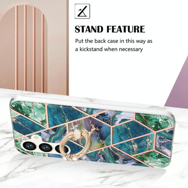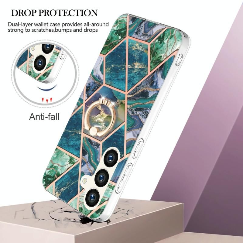 Θήκη κινητού τηλεφώνου Samsung Galaxy S24 5G, με σχέδιο μαρμάρου και λουλουδιών, IMD TPU, με δακτύλιο στήριξης (Μπλε)